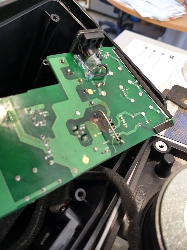 Mijn monitoring melde dat de Sonos Play 3 (rechts) op de terras niet meer bereikbaar is. Na wat klauteren en demonteren van het toestel kon je het al ruiken. Een verbrand circuit. Bij het openen zag ik het direct, wat ik eigenlijk al vermoede. Twee keer hetzelfde probleem; na de brug (AC -> DC) staat een capaciteit. Het koper baantje is volledige verbrand aan de positieve kant. Oplossing deze keer was zelfs alleen maar de Capacitiet van 400VAC 33µF te vervangen, en met het ene lange pootje (aan de + kant) kon ik net de brug bereiken, waardoor het weggebrande baantje kan overbrugt worden.